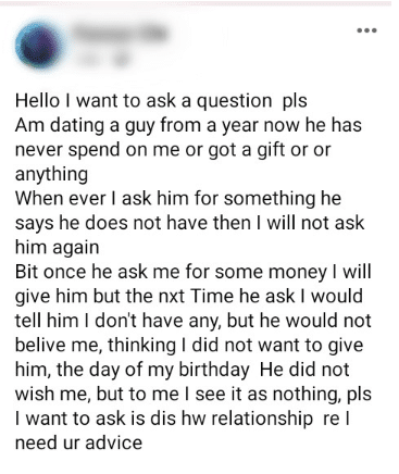 “Hello I want to ask a question pls Am dating a guy from a year now he has never spend on me or got a gift or or anything When ever I ask him for something he says he does not have then I will not ask him again Bit once he ask me for some money I will give him but the nxt Time he ask I would tell him I don’t have any, but he would not belive me, thinking I did not want to give him, the day of my birthday He did not wish me, but to me I see it as nothing, pls I want to ask is dis hw relationship rel need ur advice.”