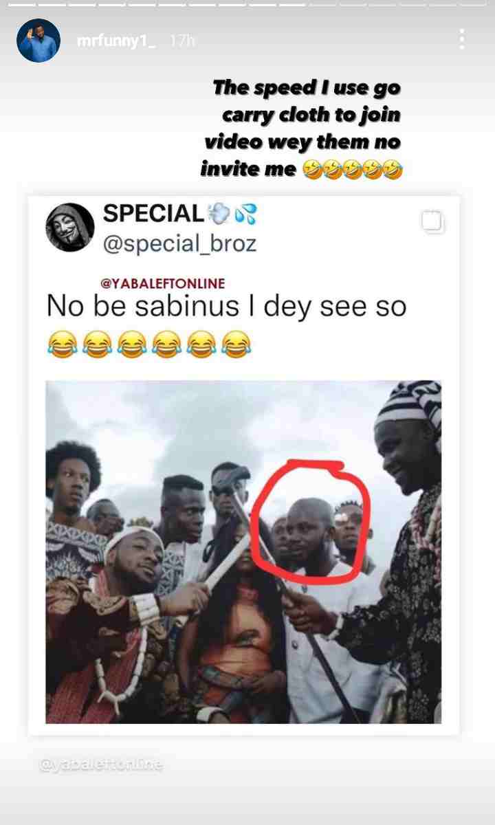 “I go carry cloth join video wey them no invite me” – Sabinus reacts after being spotted with Davido in old video