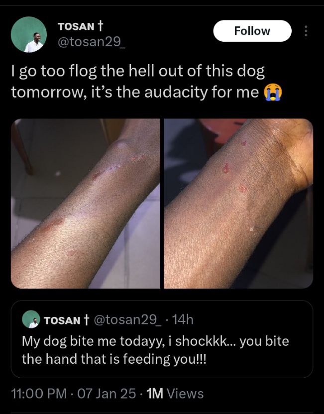 An X user, Tosan, has reacted to his dog biting him, threatening to flog the hell out of the dog.