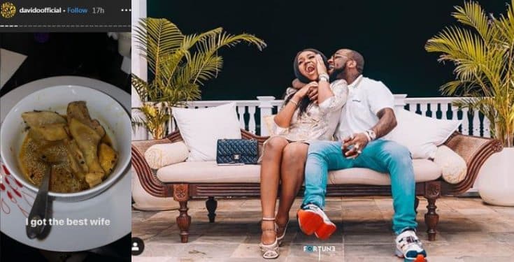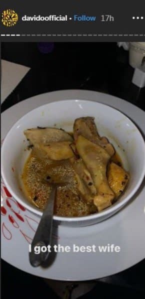 ‘I got the best wife’ – Davido says as he shares photo of chicken pepper soup Chioma made