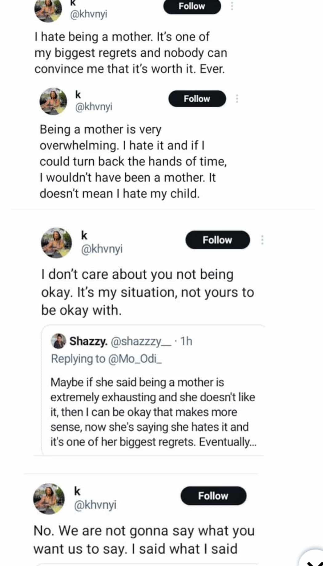 “Being a mother is very overwhelming. I hate it and if I could turn back the hands of time, I wouldn’t have been a mother. It doesn’t mean I hate my child.”