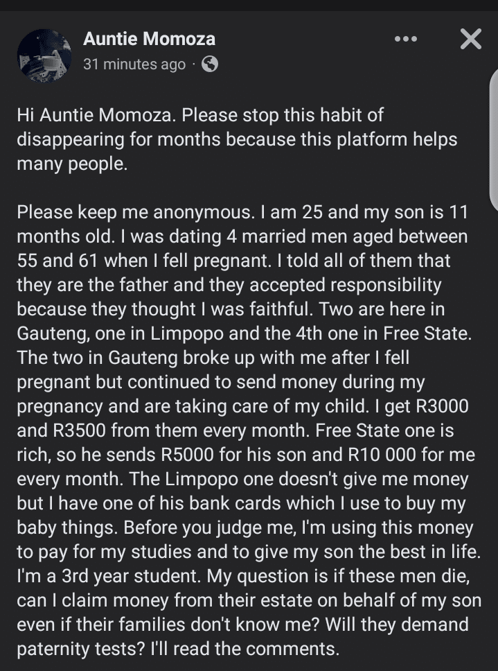 “I was dating 4 married men aged between 55 and 61 when I fell pregnant. I told all of them that they are the father and they accepted responsibility because they thought I was faithful.”