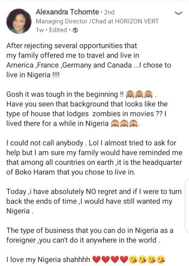 A Nigerian by the name, Alexandra Tchomte has narrated how she turned down opportunities to leave Nigeria for European countries.