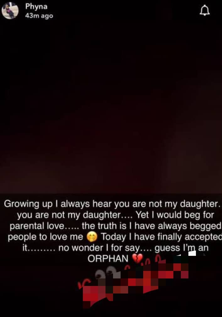 “Growing up I always hear you are not my daughter. you are not my daughter…. Yet I would beg for parental love….. the truth is I have always begged people to love me Today I have finally acceptec it……… NO wonder I for say…. guess “no an ORPHAN”