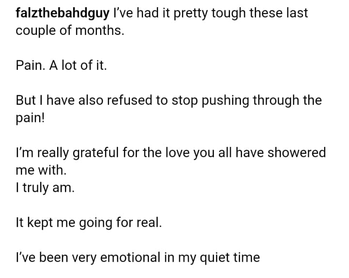 Falz however noted that despite the pain he feels, he has refused to stop pushing.