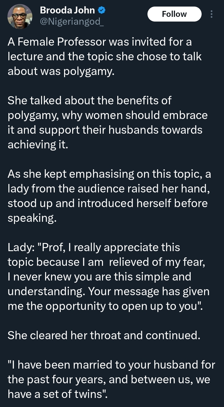 “I have been married to your husband…” — Prof faints as lady challenges her polygamy lecture