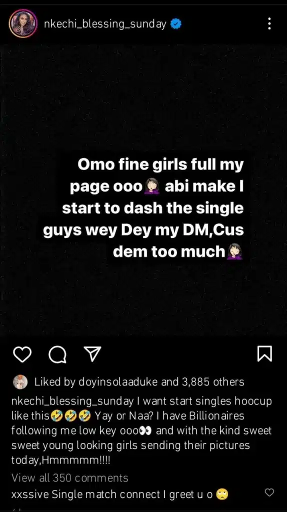 “Omo fine girls full my page ooo. Abi make I start to dash the single guys wey dey my DM, cus dem too much.