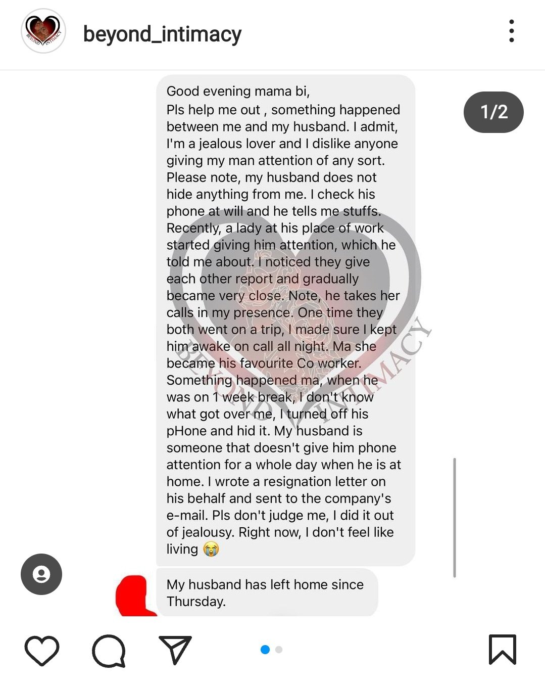 @EjodamenJunior: “Agba my take might not make sense perhaps it is based on how I am feeling as I read this. If I was the husband, I will start a relationship with that co-worker she is afraid of, and I will flirting with different women. Ogun go kee her.”