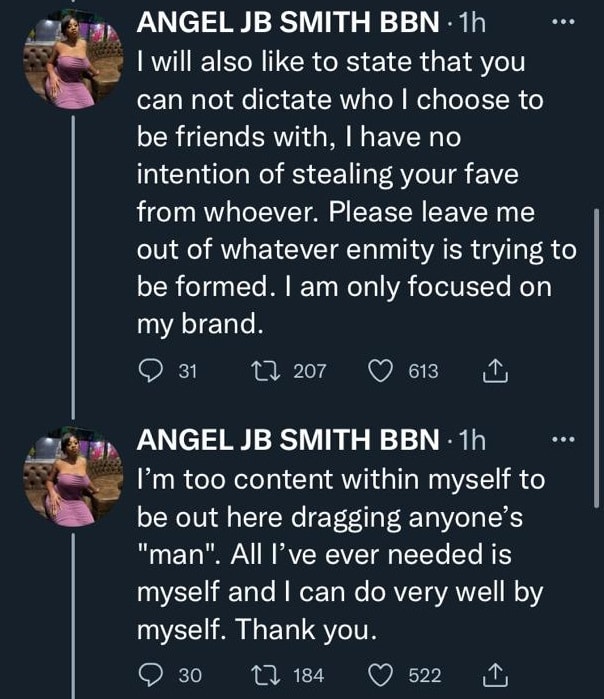 Angel in a tweet clarified that she is not in the business of jumping on other people’s partners even though her current relationship status is single.