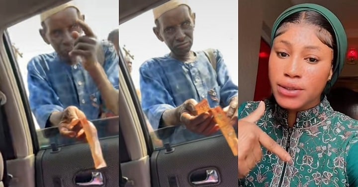 A Nigerian lady has shared a video of an elderly beggar who boldly asked her friend to change the money she gave him.