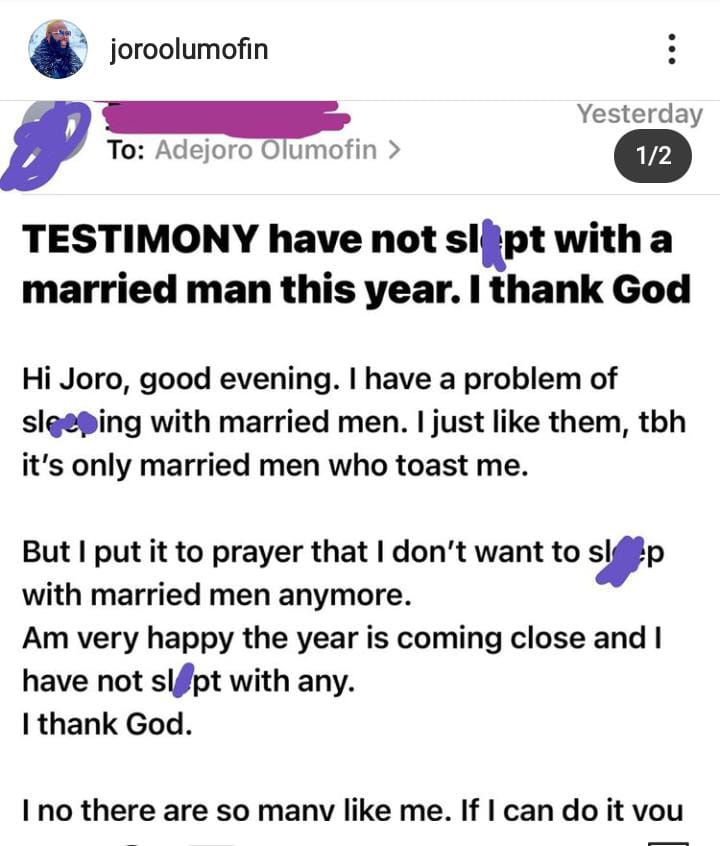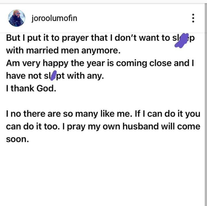 In her post to Joro Olomofin, she expressed happiness over the fact that she was able to stop sleeping with married men. She also prayed for other ladies like her who only feel attached to married men.