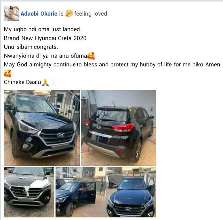 A woman identified on Facebook as Adaobi Okorie has shut down speculations that the car gift she received from her husband on her birthday came as a result of her submissive nature.