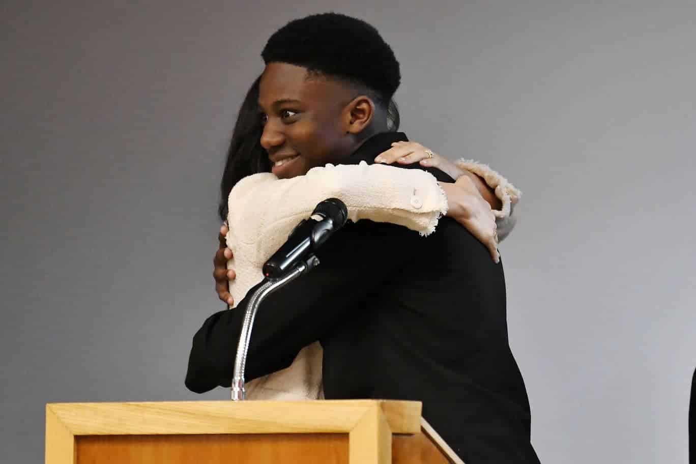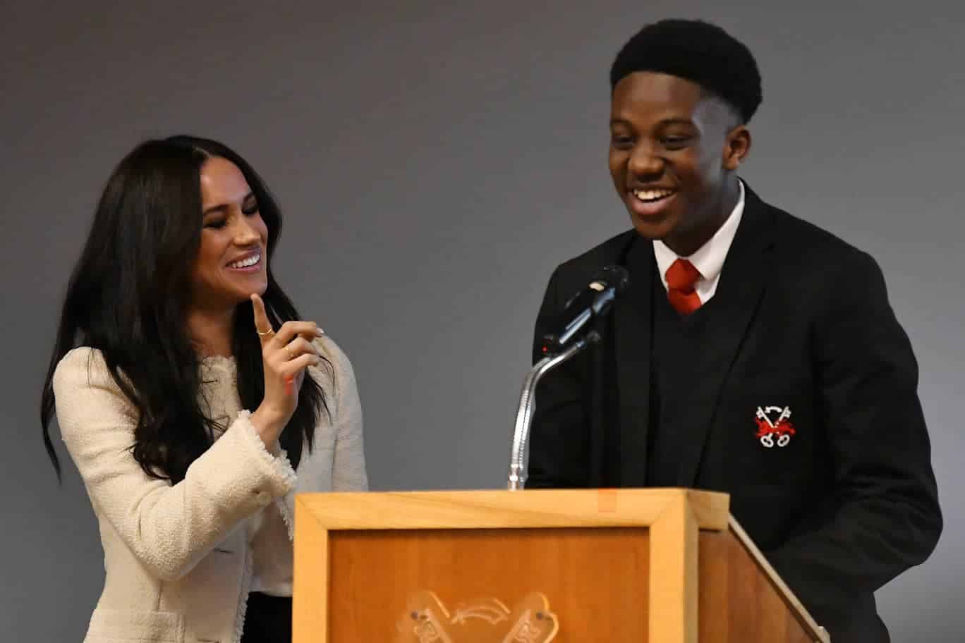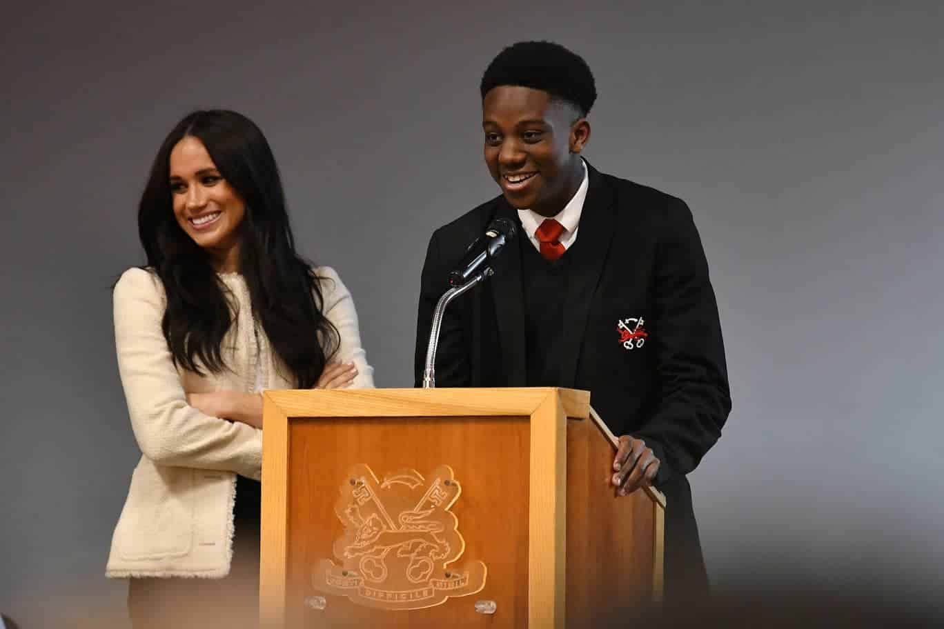 Okoye who is the head boy of his school, received a rapturous applause when he bounded on stage to embrace the Duchess of Sussex after she asked if anyone wanted to give a speech.