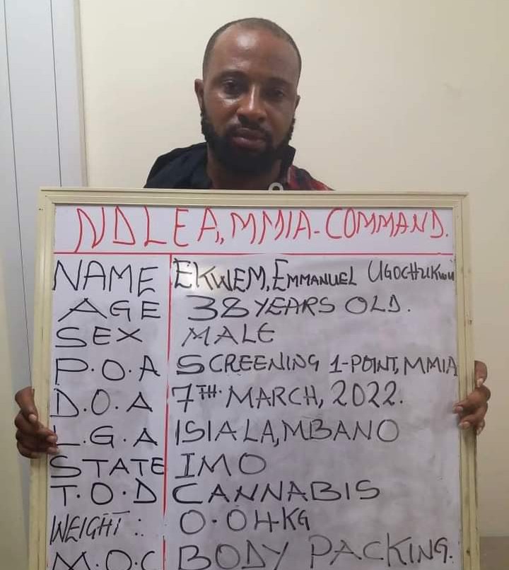 He was arrested with 54 sticks of drugs wrapped around his body at the Murtala Muhammed International Airport, Ikeja, Lagos State.