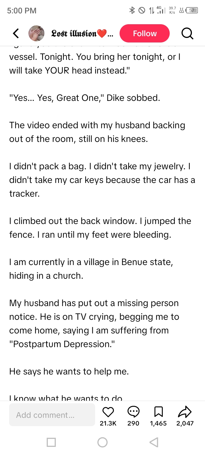 The woman shared that the 6‑month‑old baby had a conversation with her husband, who revealed that the lady meant for the sacrifice had escaped.