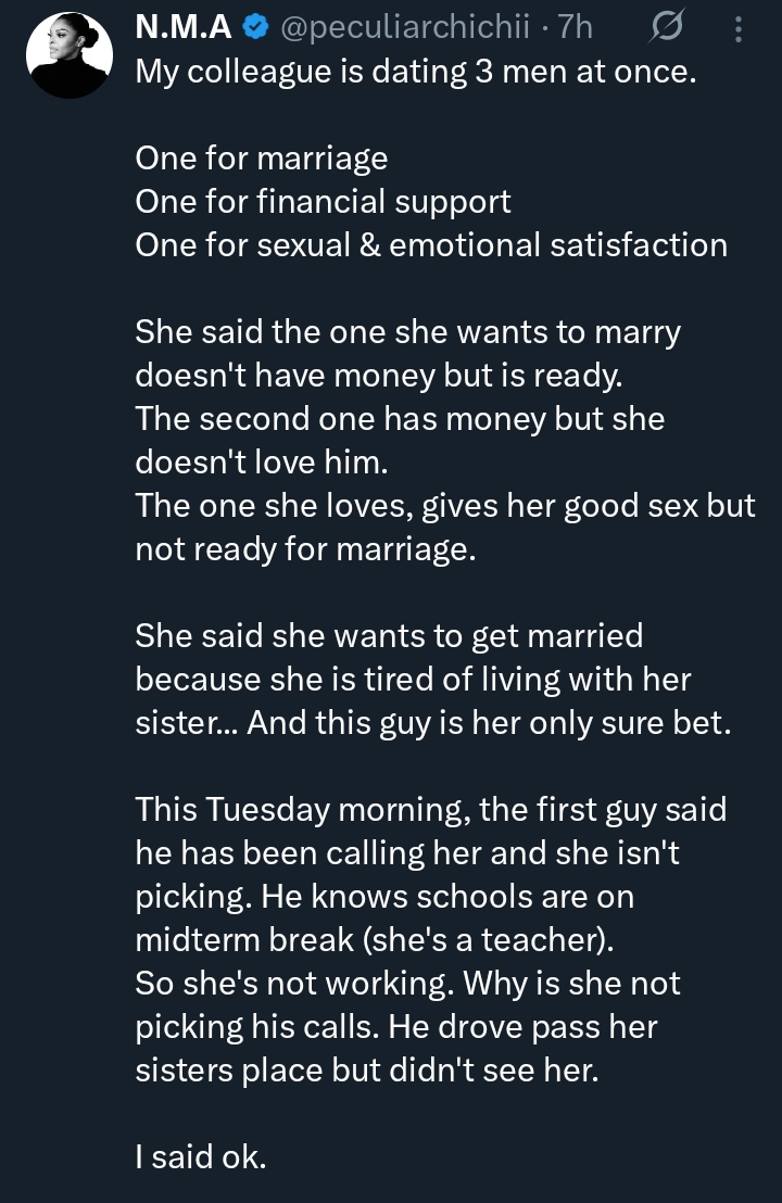 According to the post, the colleague, a school teacher, had been dating three men at the same time, each for a different reason.