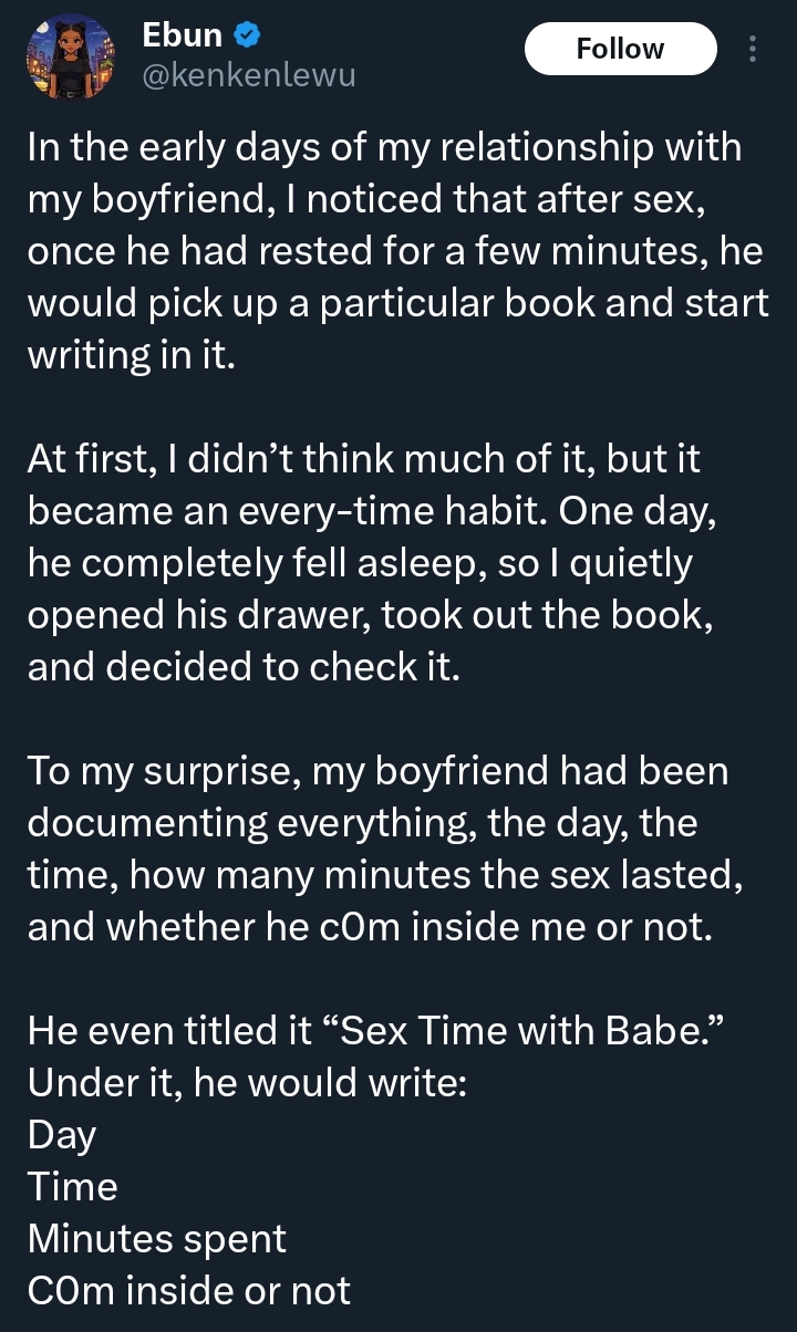 “I just weak” — Lady shocked as boyfriend write down date, time and minutes after sex