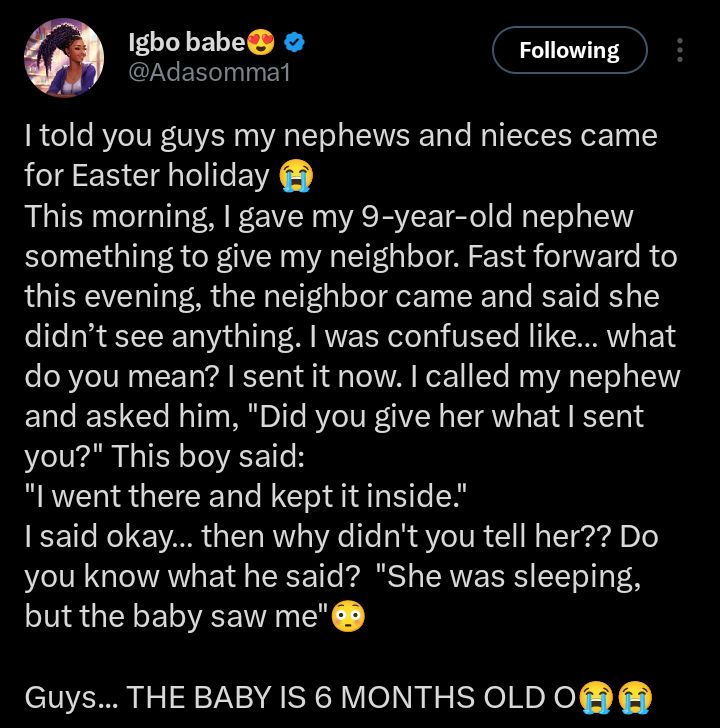 “I kept it inside because she was sleeping… ” — Lady recounts nephew’s surprising explanation