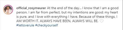 “At the end of the day… I know that I am a good person. I am far from perfect, but my intentions are good; my heart is pure, and I love with everything I have. Because of these things, I AM WORTH IT. ALWAYS HAVE BEEN, ALWAYS WILL BE. ?,” she wrote.