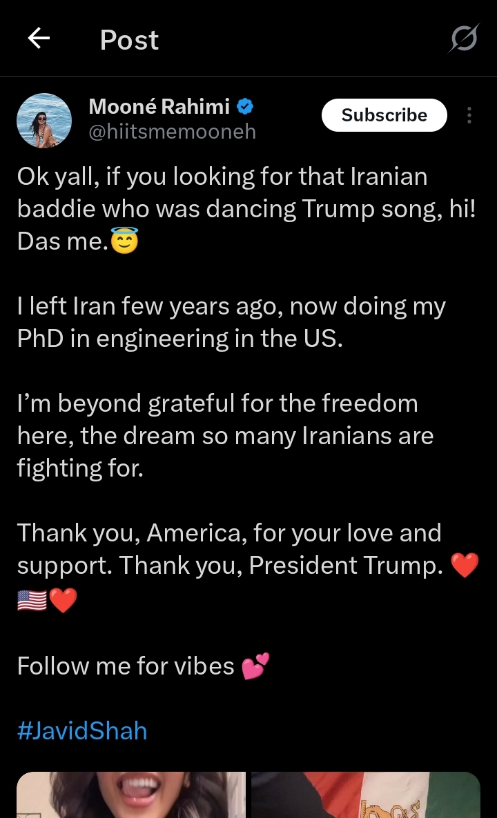 Ok yall, if you looking for that Iranian baddie who was dancing Trump song, hi! Das me.😇I left Iran few years ago, now doing my PhD in engineering in the US.I’m beyond grateful for the freedom here, the dream so many Iranians are fighting for.