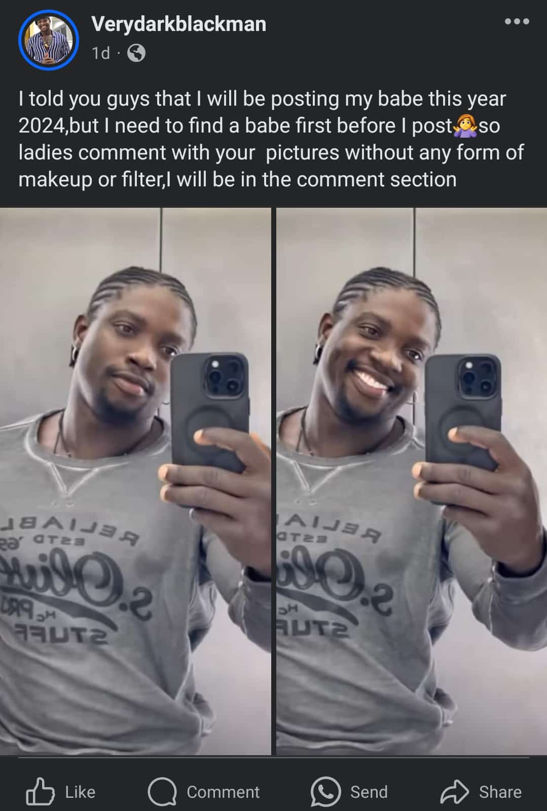 Online personality, Verydarkman attracted attention on Facebook when he asked single ladies to comment with their picture for a chance to become his girlfriend.