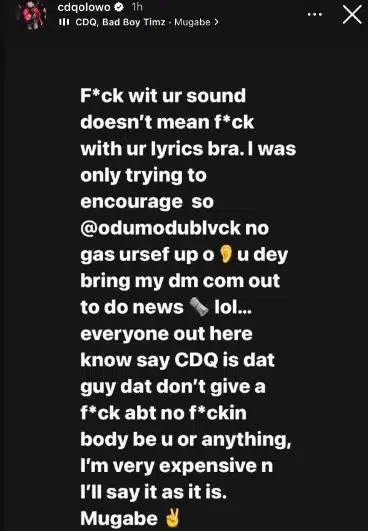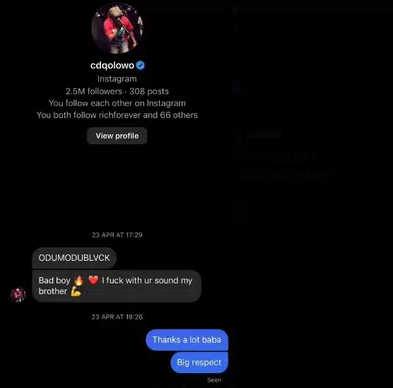 However, the Odumdublvck shared a screenshot where CDQ came to his DM to praise his music.
