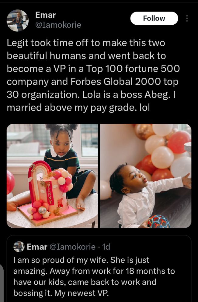 “Legit took time off to make this two beautiful humans and went back to become a VP in a Top 100 fortune 500 company and Forbes Global 2000 top 30 organization. Lola is a boss Abeg. I married above my pay grade. lol