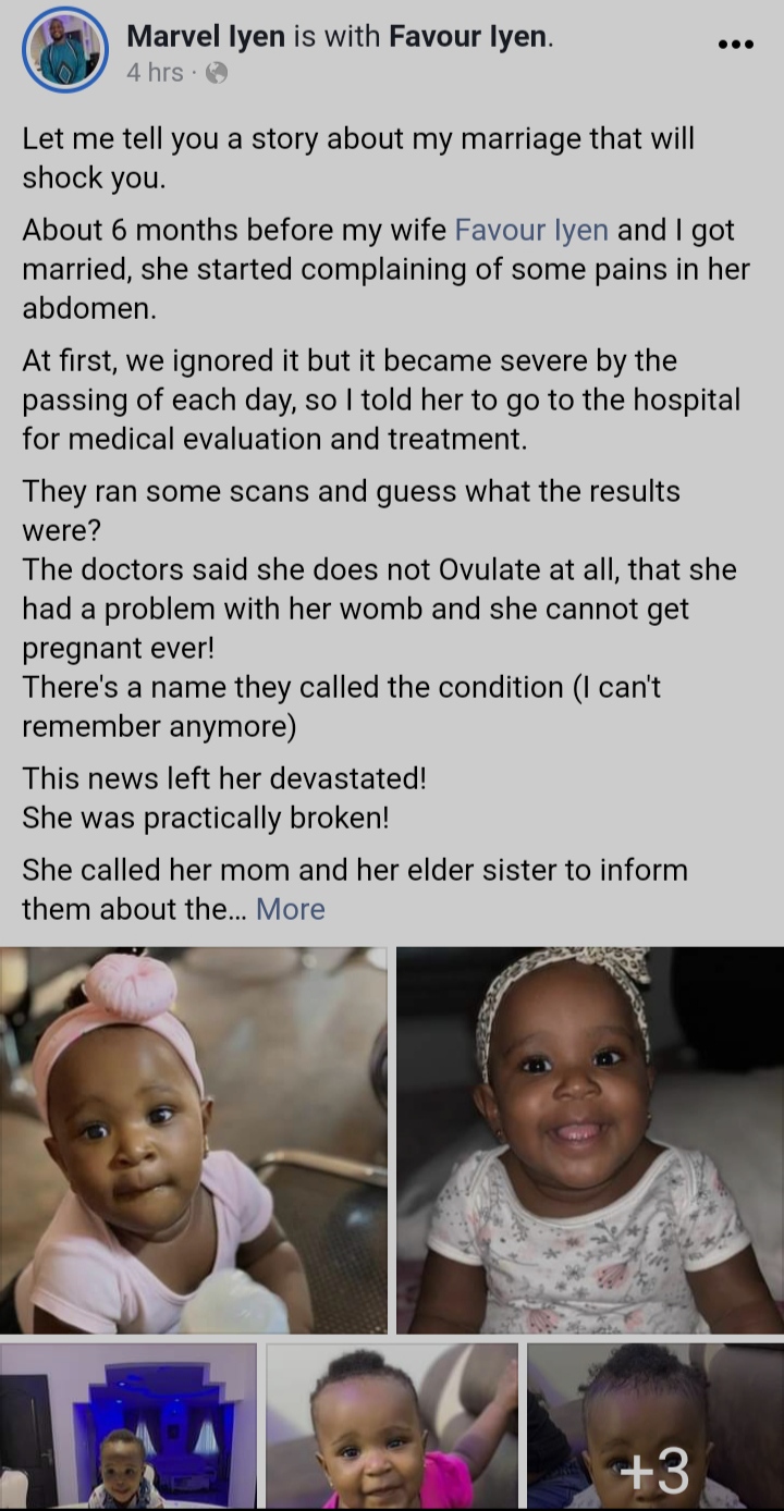 The man identified as Marvel Iyen revealed he married his wife even after the test results showed she could never be pregnant.