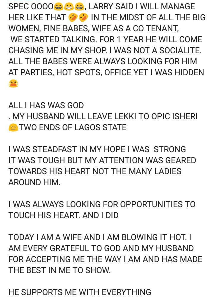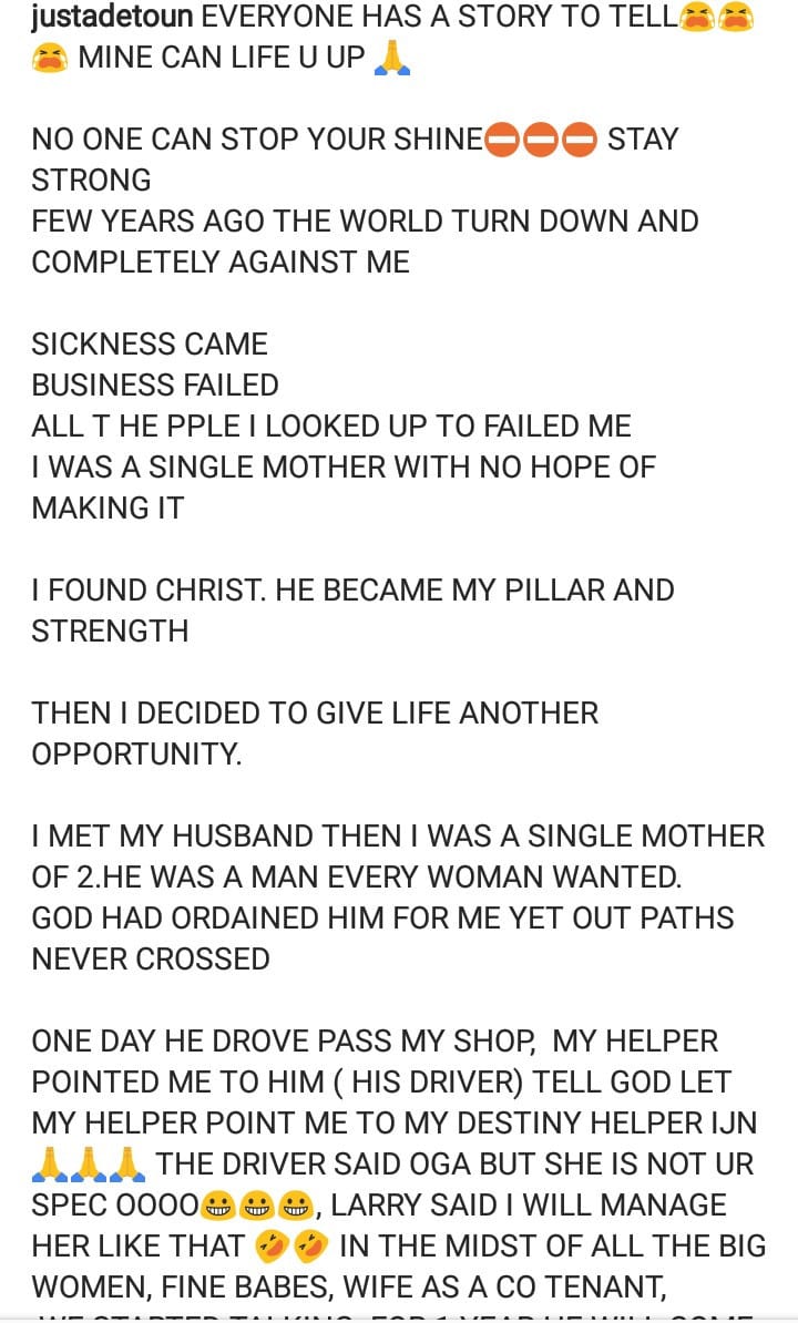 The woman went on to narrate how she remained “steadfast” despite the fact that many ladies wanted him. According to Adetoun, she went straight to touch his heart.