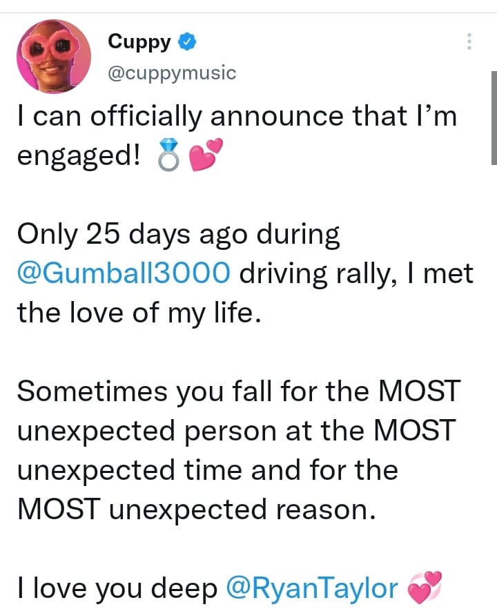 Dj Cuppy reveals she met her fiancé, Ryan Taylor, 25 days ago