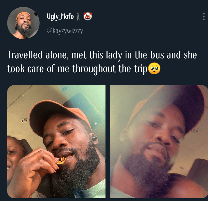 A young man identified as @kayzywizzzy on Twitter has revealed how a female stranger he met on a bus took care of him throughout the trip.