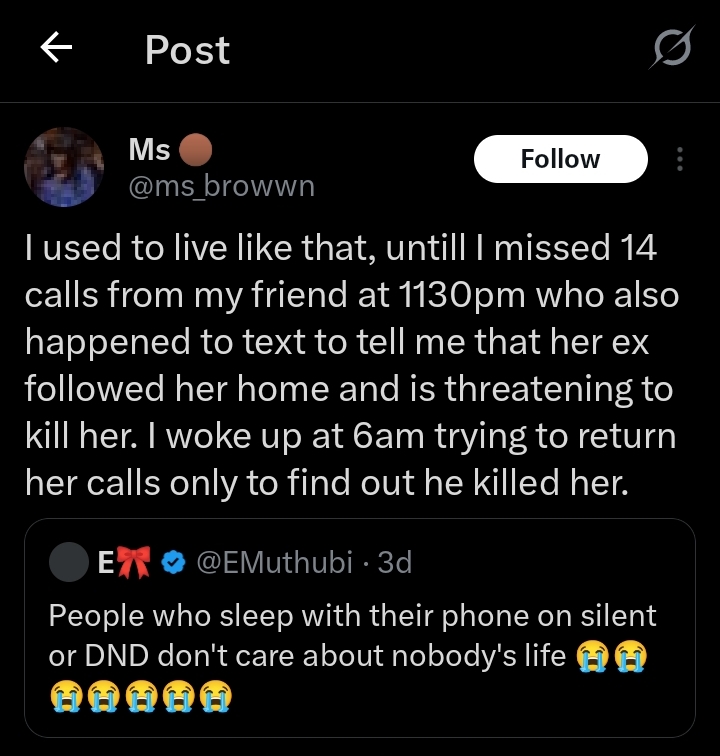 The lady identified as @msbrownn_kn on X (formerly Twitter) shared the heartbreaking incident about her friend in response to a tweet about Do Not Disturb (DND) mode users.