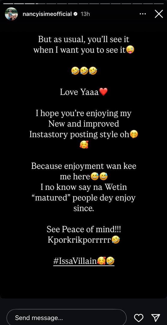Taking to her Instagram story, Nancy Isime disclosed that she has been enjoying herself with what mature people do to stay happy.