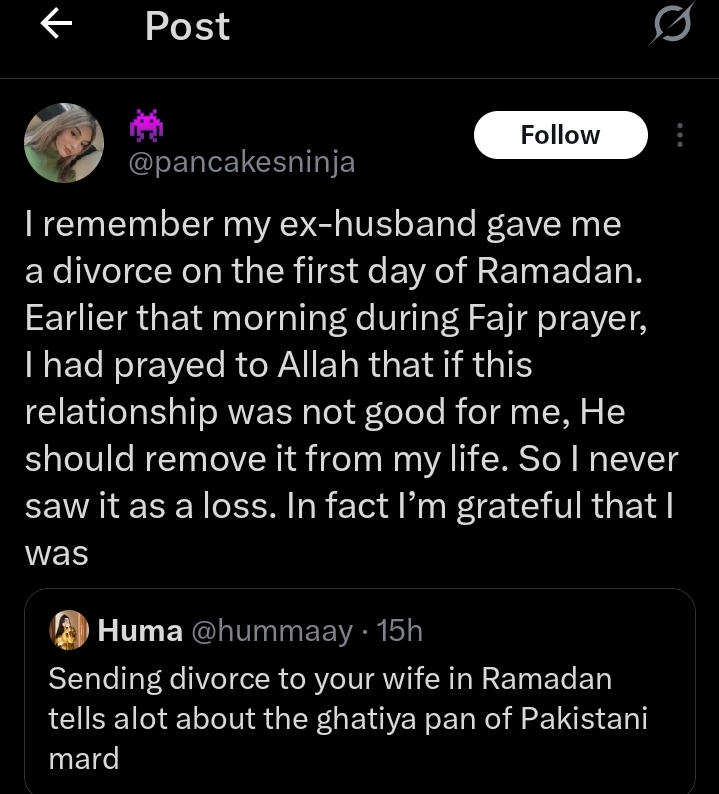”I remember my ex-husband gave me a divorce on the first day of Ramadan. Earlier that morning during Fajr prayer, I had prayed to Allah that if this relationship was not good for me, He should remove it from my life. So I never saw it as a loss. In fact I’m grateful that I was freed from a manipulative, cheating, and abusive partner”, Her tweet reads.