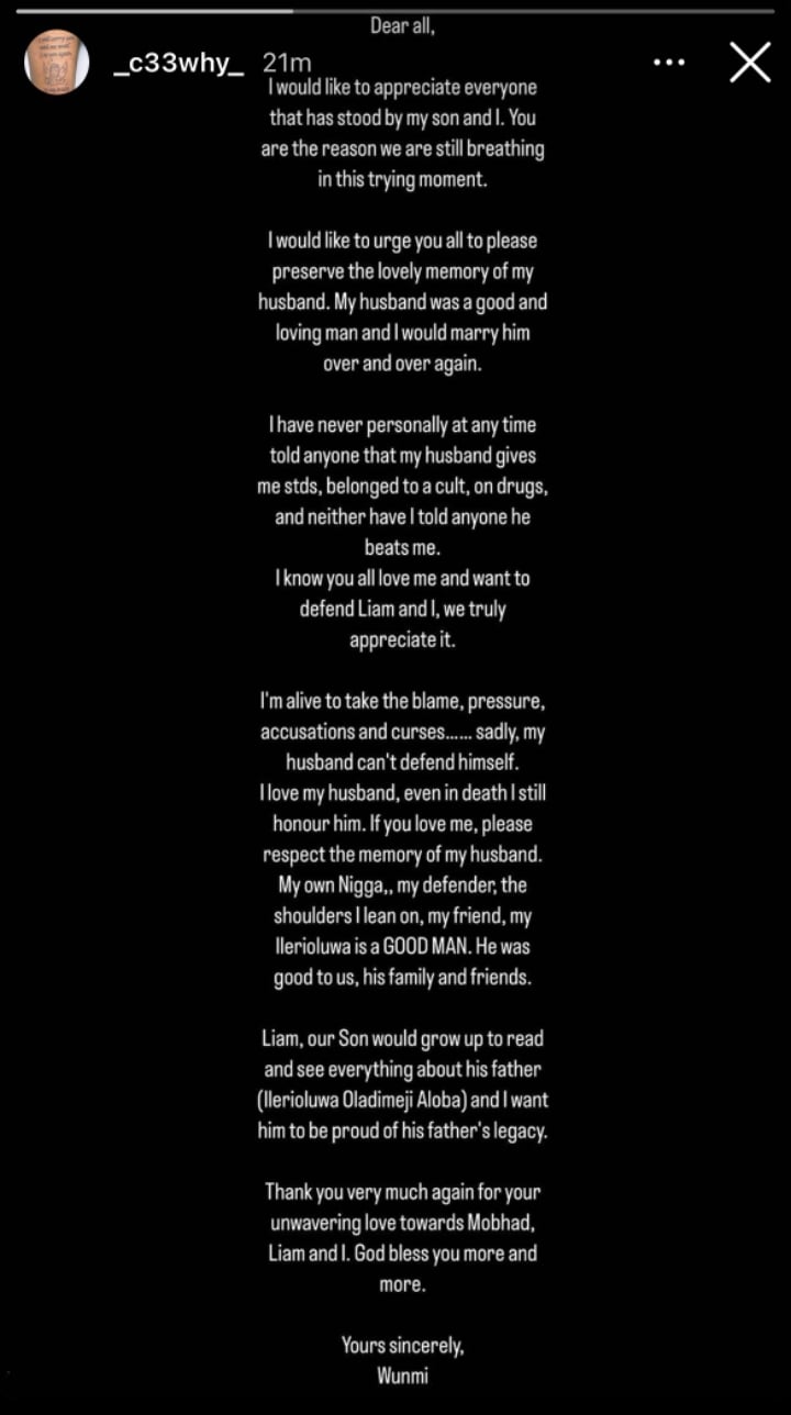 I’m alive to take the blame, pressure, accusations, and curses. Sadly, my husband can’t defend himself. I love my husband, even in death I still honor him. If you love me, please respect the memory of my husband. My own Nigga, my defender, the shoulder I lean on, my friend, my Ileriouluwa is a Good man. He was good to us, his family and friends.
