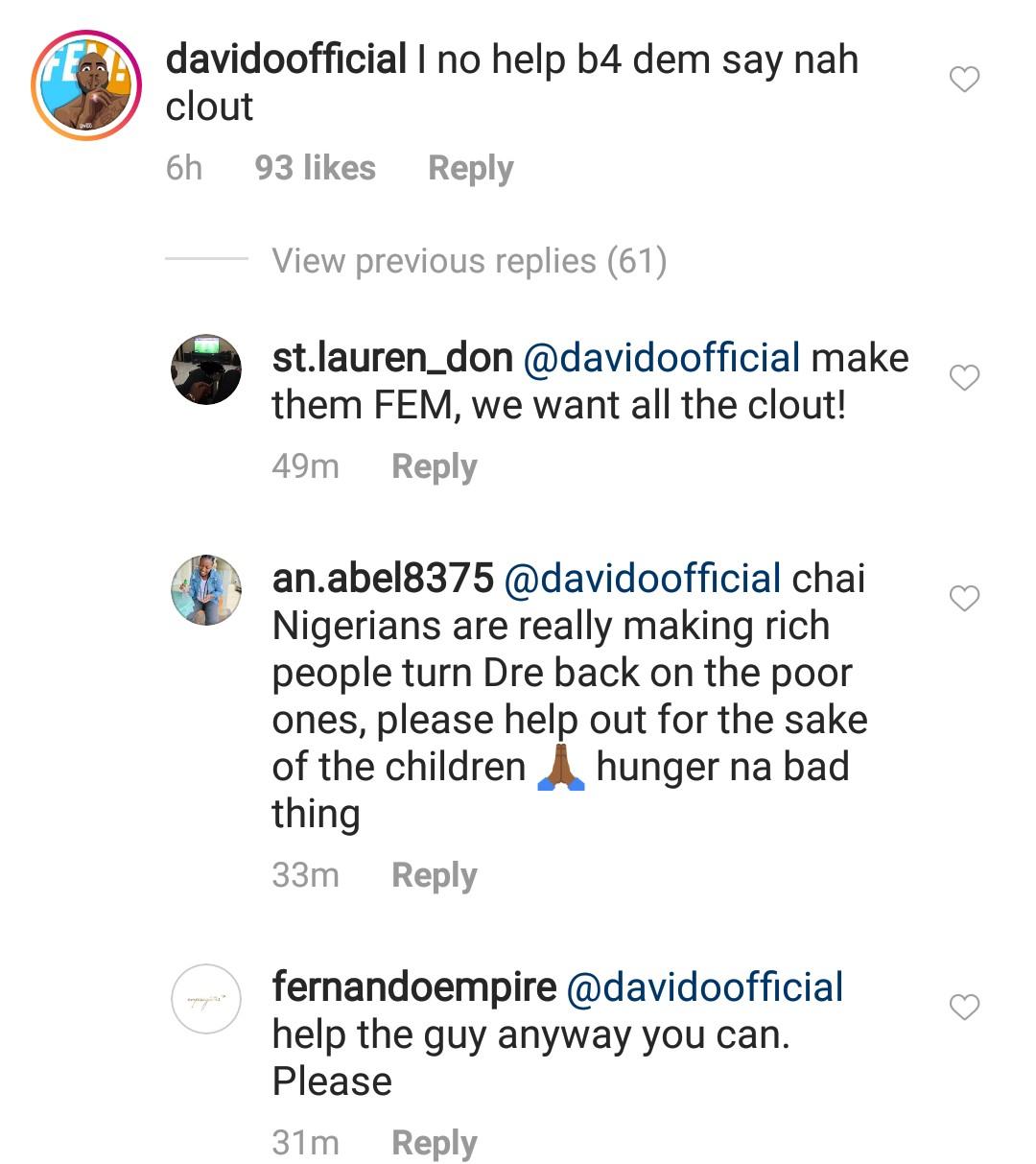 Reacting to this, Davido said he is not ready to help anyone because some Nigerians will tag him a “clout chaser”.