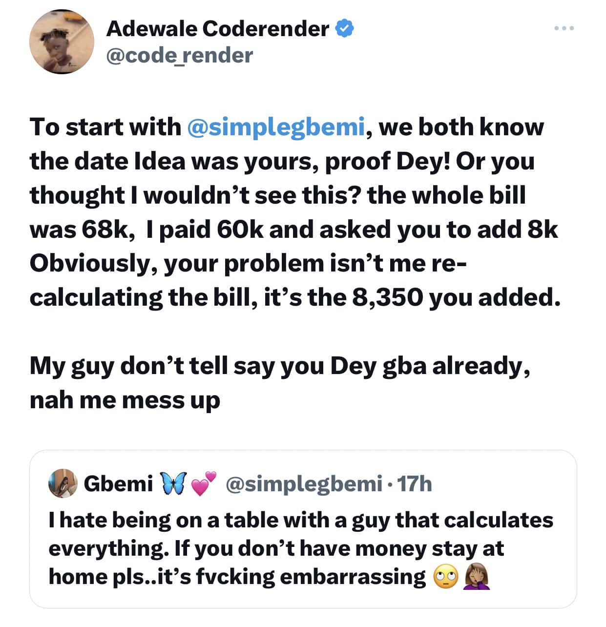 He said, “To start with @simplegbemi, we both know the date idea was yours, proof dey! Or you thought I wouldn’t see this? The whole bill was 68k, I paid 60k and asked you to add 8k.”