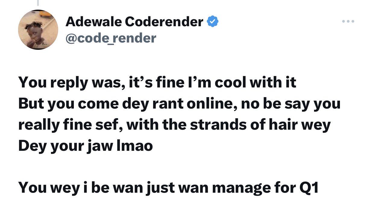 “Obviously, your problem isn’t me recalculating the bill, it’s the 8,350 you added. Your reply was, ‘it’s fine I’m cool with it.’ But you come dey rant online, no be say you really fine sef, with the strands of hair wey dey your jaw lmao. You wey I be wan just wan manage for Q1.”