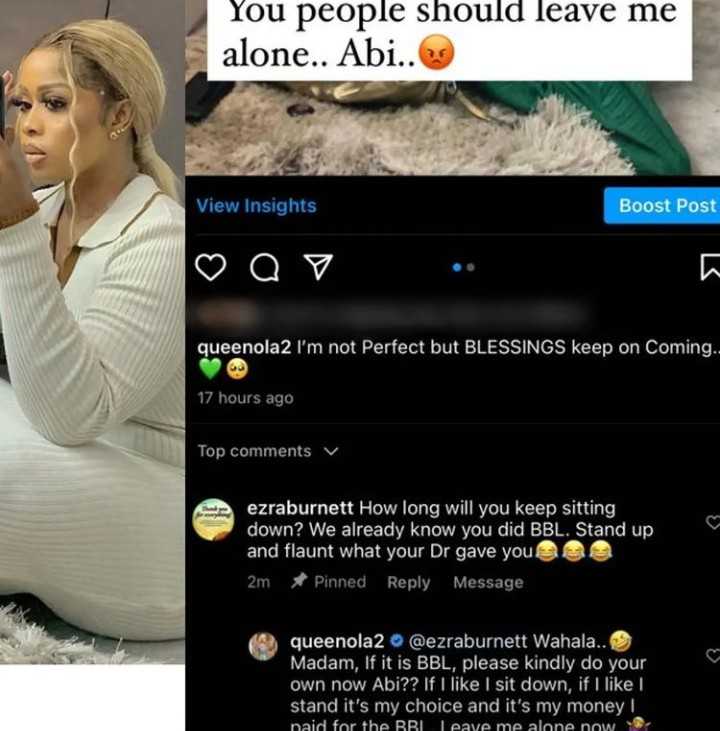 On Instagram, she wrote: “Madam, if it is BBL, please kindly do your own now Abi?? If I like I sit down, if I like I stand. It’s my choice and it’s my money. I paid for the BBL. Leave me alone now.”