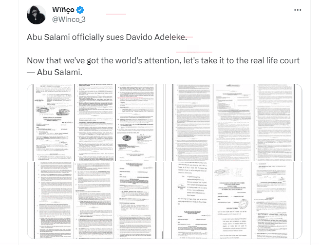 A post made by a Twitter user identified as @Winco_3 showed the several documents which are alleged to belong to the case involving the Davido and Abu Salami.