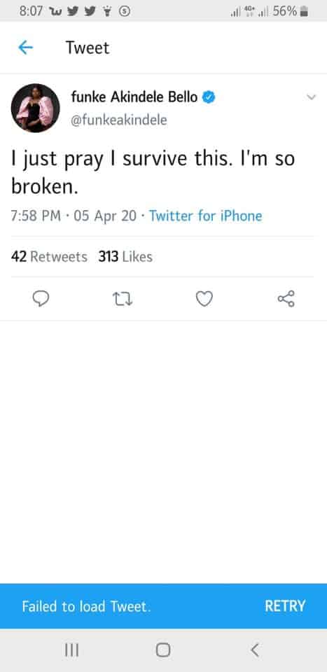 Funke Akindele shared her anguish on Twitter, just after being arrested by the Lagos State Police for violating a lockdown order on Coronavirus.