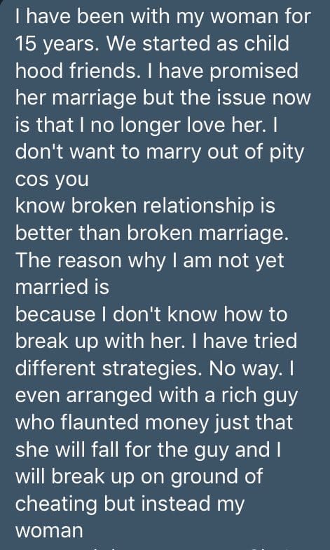 Sharing his story on Twitter, he wrote; “I have been with my woman for 15 years. We started as childhood friends. I have promised her marriage but the issue now is that I no longer love her. I don’t want to marry out of pity cos you know broken relationship is better than a broken marriage.