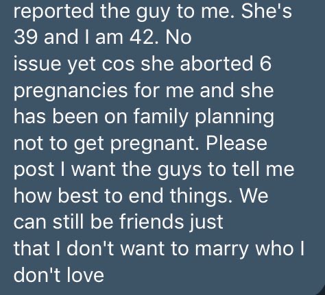“No issue yet cos she aborted 6 pregnancies for me and she has been on family planing not to get pregnant. I want the guys to tell me how best to end things. We can still be friends just that I don’t want to marry who I don’t love.