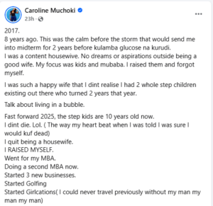 “2017. 8 years ago. This was the calm before the storm that would send me into midterm for 2 years before kulamba glucose na kurudi. I was a content housewife. No dreams or aspirations outside being a good wife. My focus was kids and mubaba. I raised them and forgot myself,” she wrote.