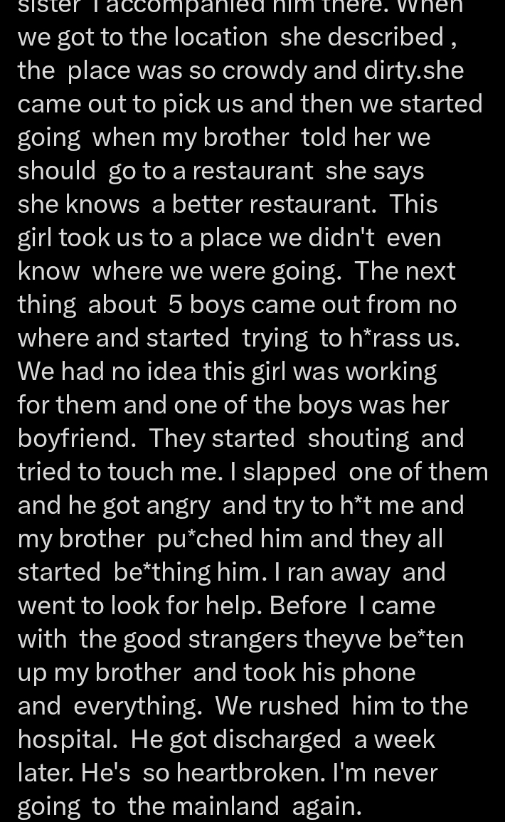 A lady has shared a heartbreaking account after her brother visited a girl he met online, with the incident going viral online.