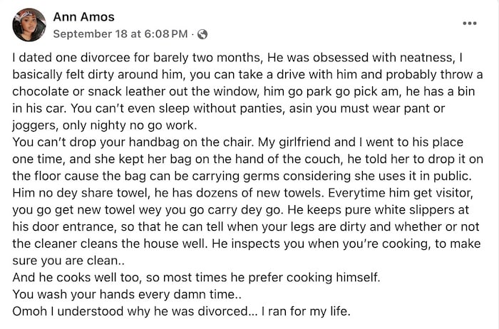 “I dated one divorcee for barely two months, He was obsessed with neatness, I basically felt dirty around him. You can take a drive with him and probably throw a chocolate or snack leather out the window, him go park go pick am, he has a bin in his car.