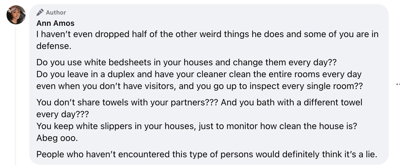 A Facebook user identified as Ann Amos recounted how the man’s need for absolute order and hygiene left her feeling “dirty” in his presence.