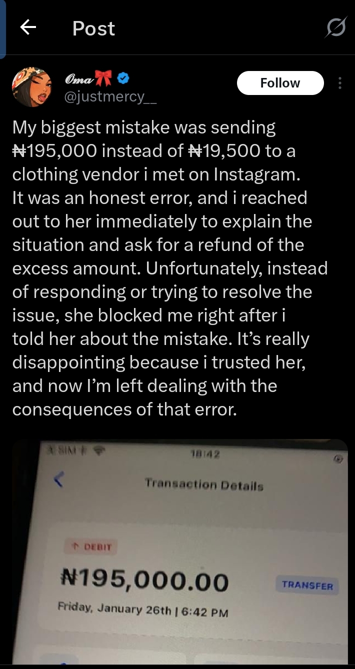 ‎An X user has shared a heartbreaking encounter after mistakenly transferring ₦195,000 to a clothing vendor.