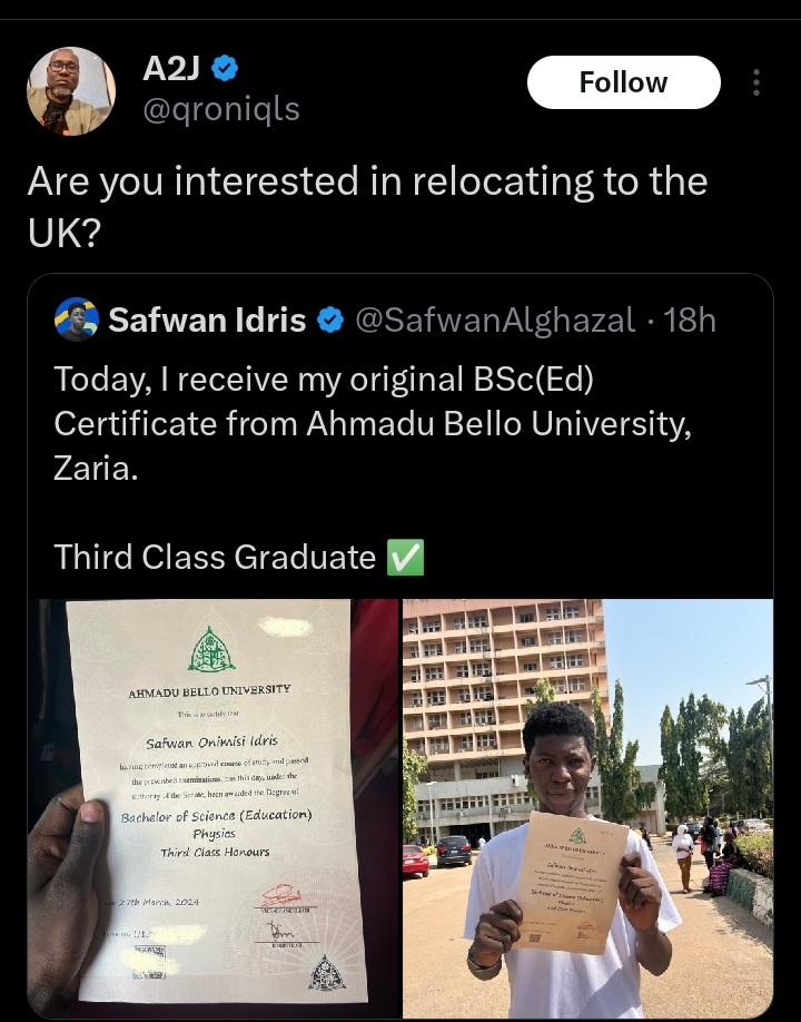 The graduate, identified with the X handle, @SafwanIdris, posted his degree certificate.