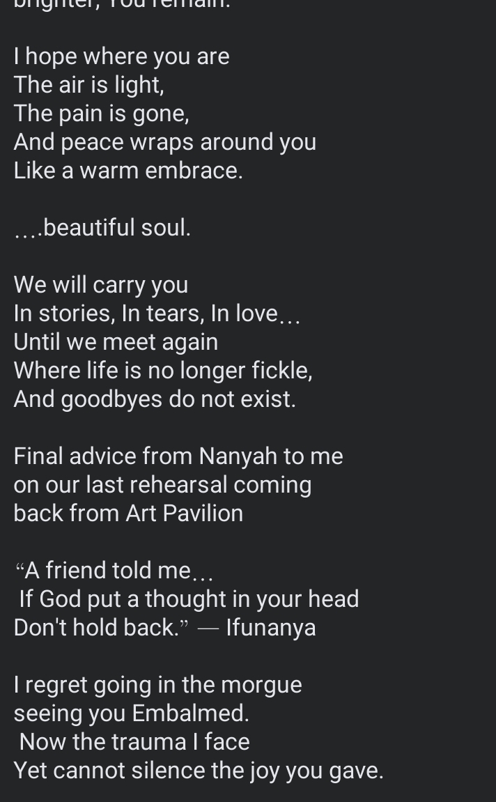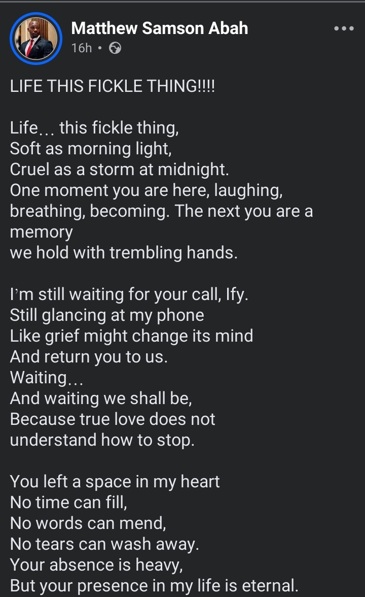 ‎The man identifed with the Facebook handle, Matthew Samson Abah shared that Ifunanya’s death has left an irreplaceable void in his heart.
